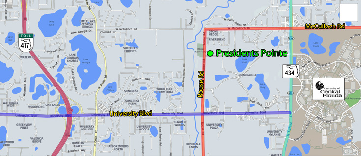 Presidents Pointe is a 33 -75’ x 120’ estate-lot community on 12.5-acre property on Rouse Road, in the University of Central Florida Area of east Orlando.